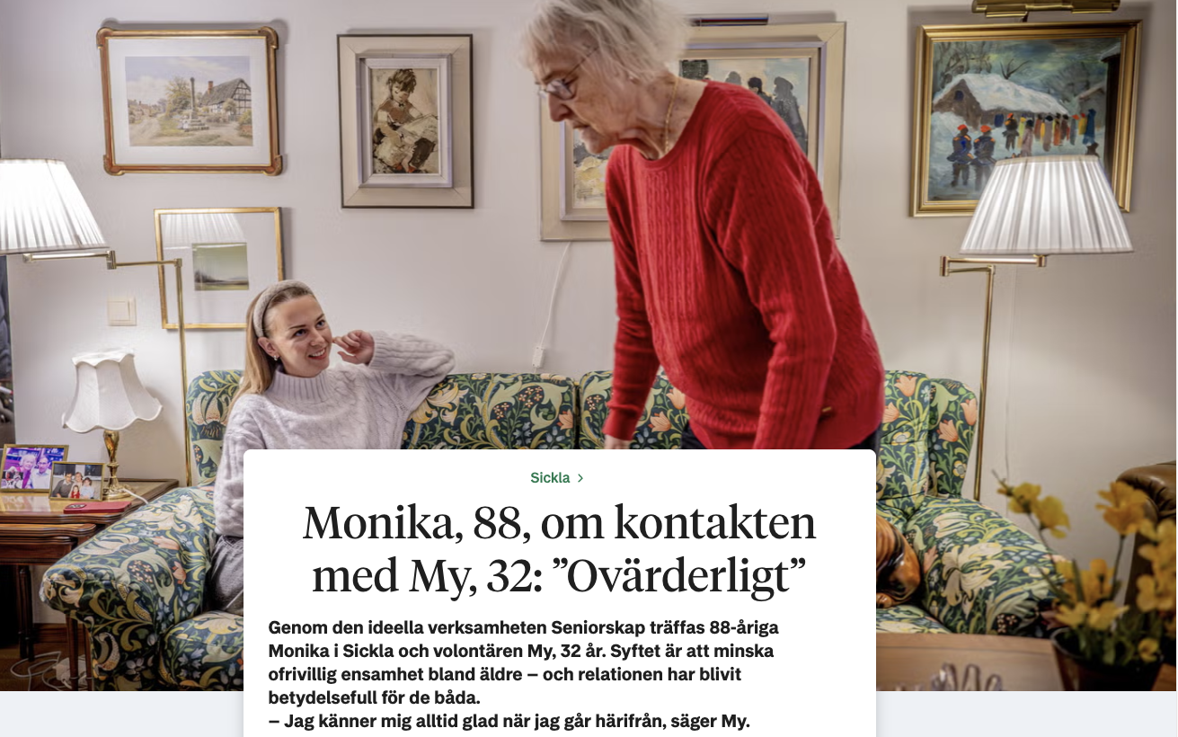 Monika och My möttes genom Seniorskap 2025, och har sen dess träffats regelbundet och byggt en fin relation. Nacka Värmdöposten intervjudade dom båda för att höra deras berättelse om vad relationen betyder för dom. Det var en personligt och positiv artikel som går att läsa här: https://www.nvp.se/artikel/monika-88-om-kontakten-med-my-32-ovarderligt/
