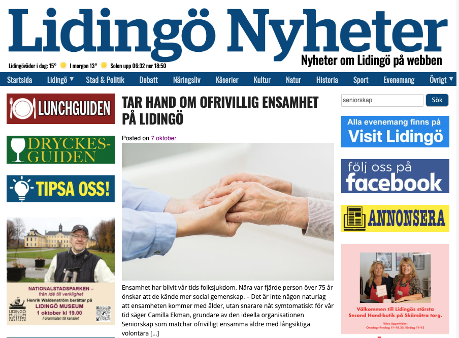 Seniorskap finns nu på Lidingö. Detta uppmärksammas i Lidingö Nyheter med rubriken "Tar hand om frivillig ensamhet på Lidingö". Grundare Camilla Ekman blir intervjuad om arbetet.